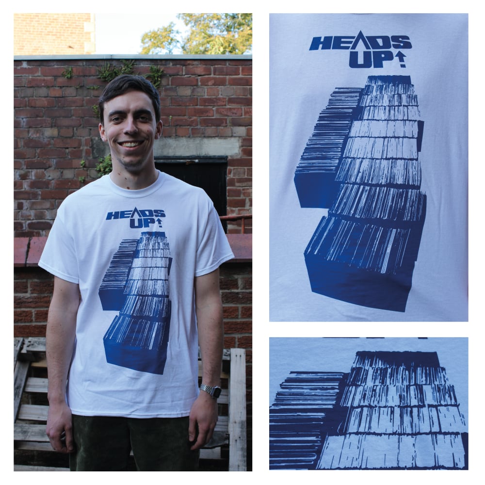 We are pleased to announce the release of our first T-shirt, featuring the Heads Up logo alongside a stacks of wax illustration. These are screen printed on high quality heavy cotton Gildan tees, and this blue on white colourway is strictly limited! Sizes available are S, M, L, and XL.